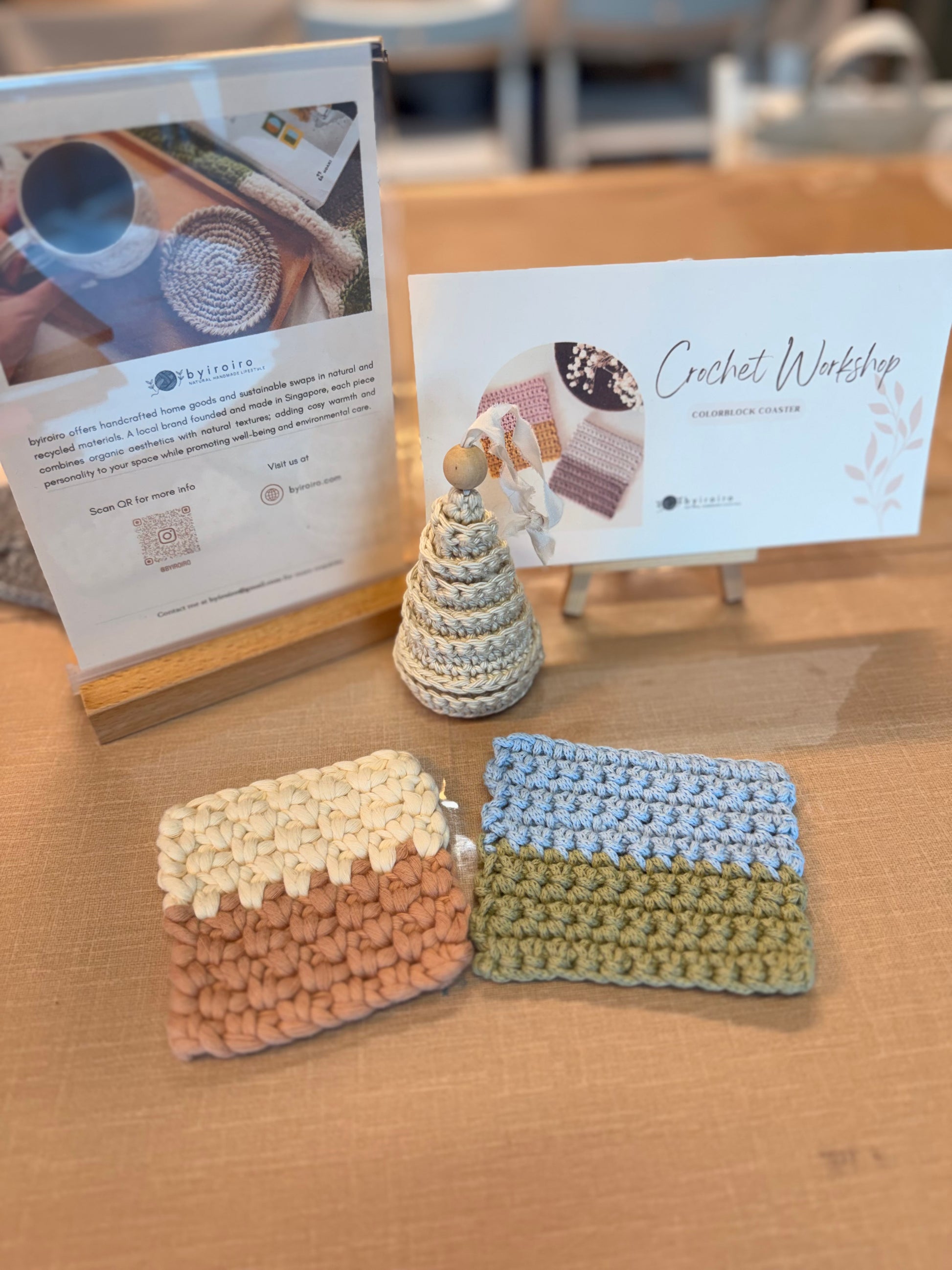 - All materials for class including a hook, 2 colours of yarn (enough for 2 coasters), yarn needle, stitch markers, printed pattern that includes QR code to video tutorial for you to review/complete your project at home.